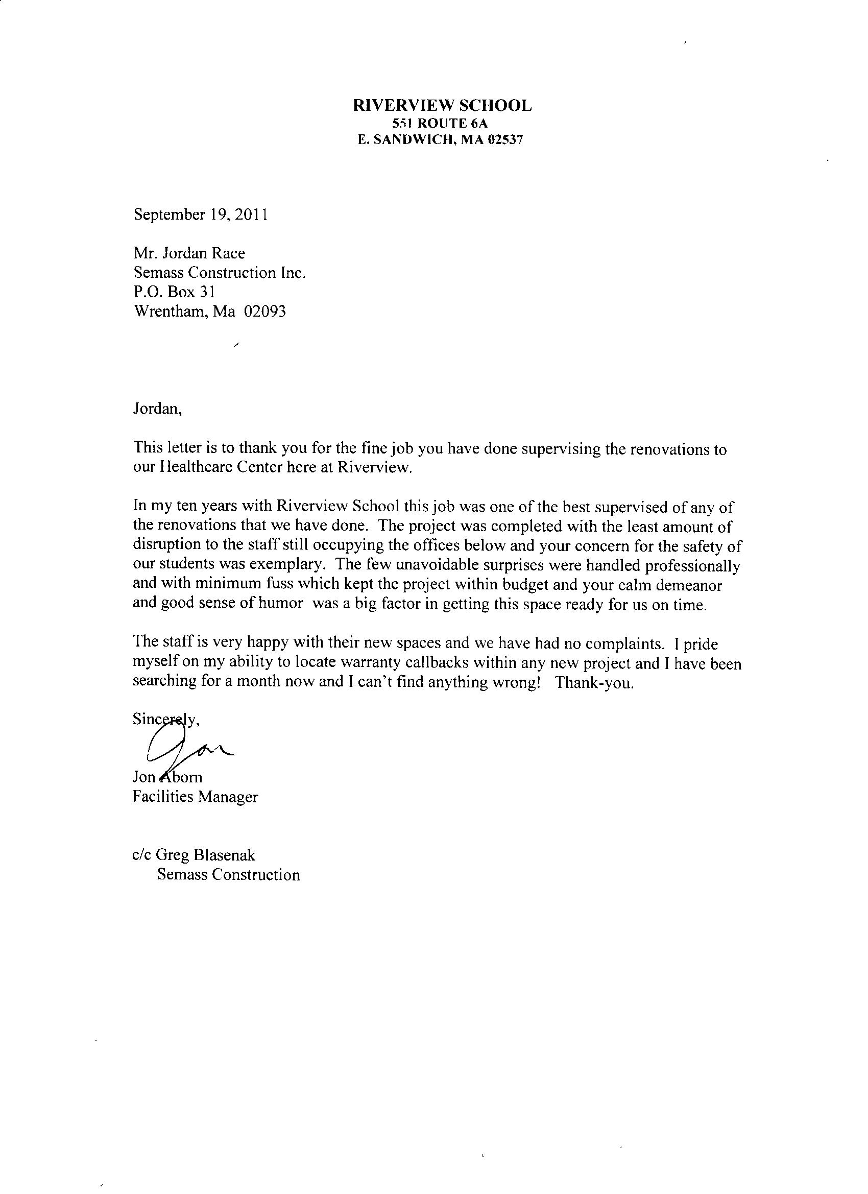 In my ten years with Riverview School this job was one of the best supervicesd of any of the renovations that we have done. The project was completed with the least amount of disruption to the staff still occupying the offices below and your concern for the safety of our students was exemplary. The few unavoidable suprises where handled professionally and with minimum fuss which kept the project within budget and your calm demeanor and good sense of humor was a big factor in getting this space ready for us on time.