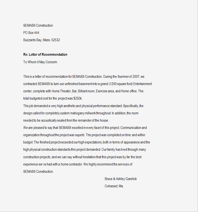 This is a letter of recommendation for SEMASS Construction. During the Summer of 2007, we contracted SEMASS to turn our unfinished basement into a grand (1200 sqaure foot) Entertainment center, complete with Home Theater, Bar, Billiard room, Exercise area, and Home office. The total budgeted cost for the project was $250k.